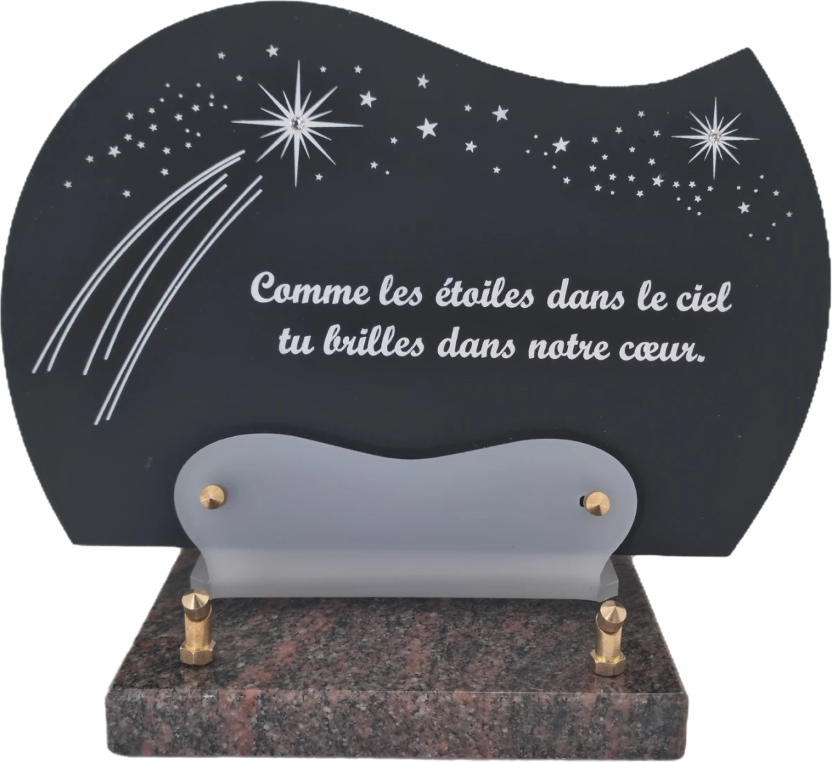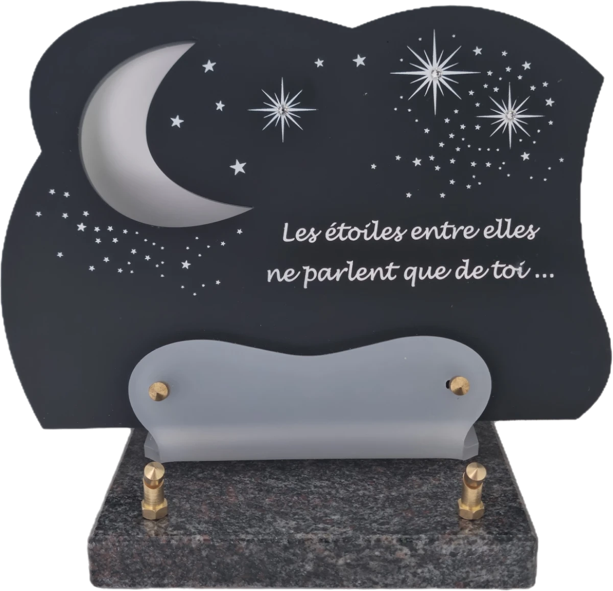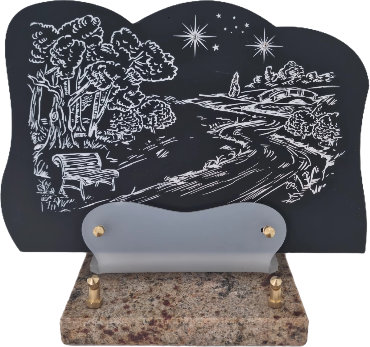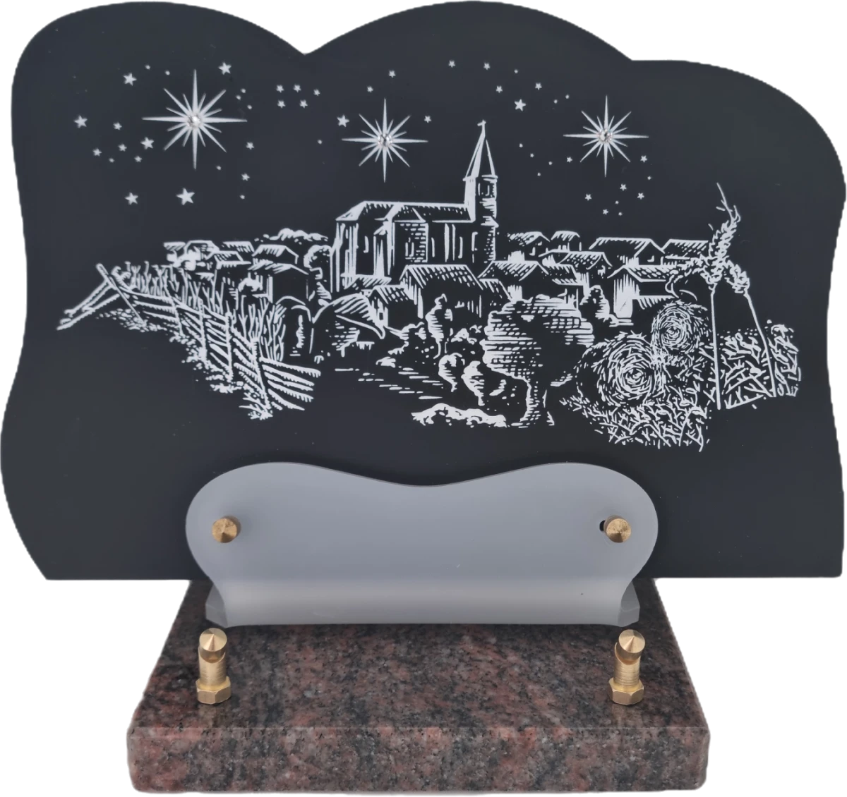 Altuglass Satin Black sur socle granit Plaque en Altuglas sur socle granit représentant un village paisible sous un ciel étoilé, bordé par un arbre de vie.