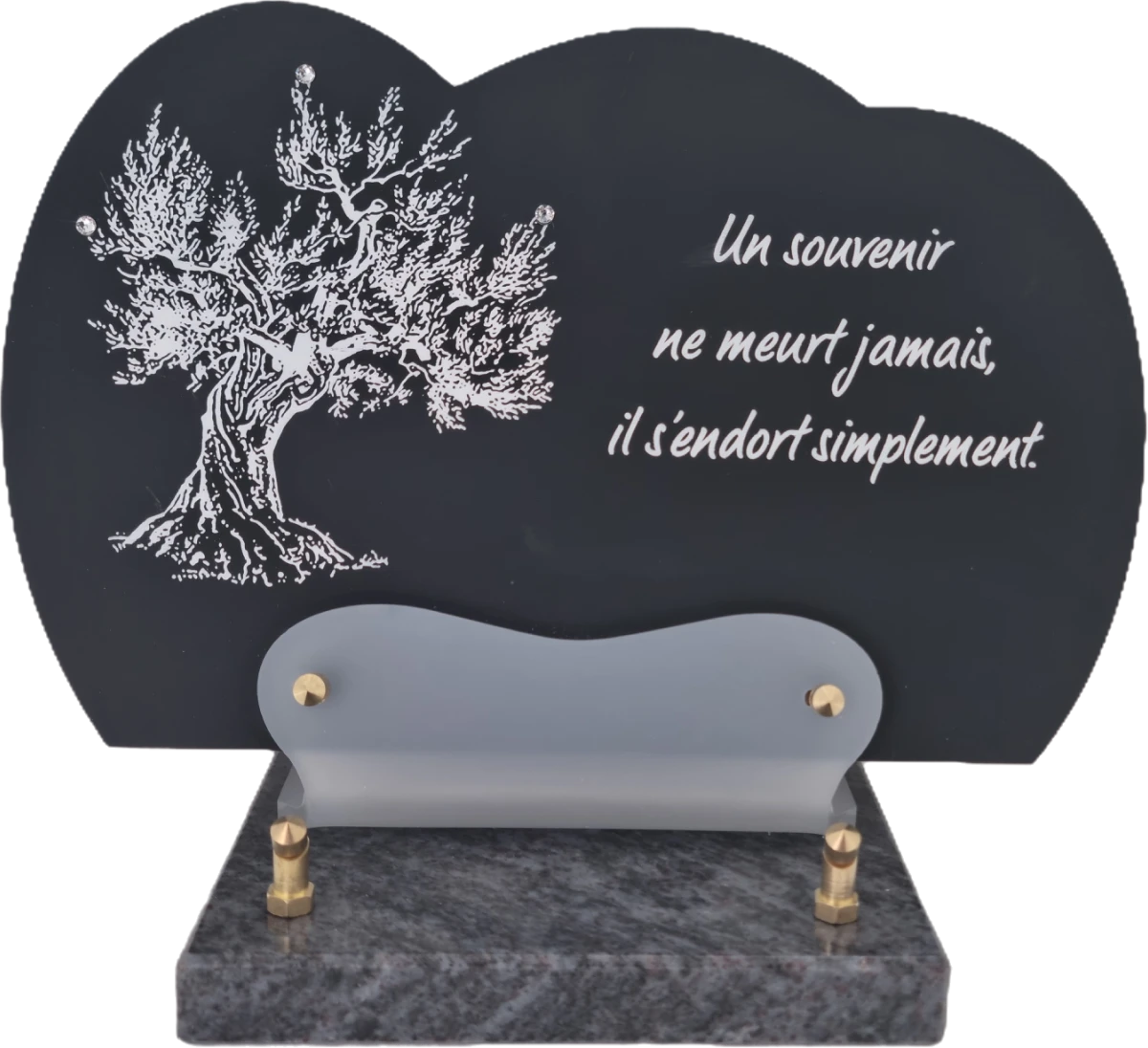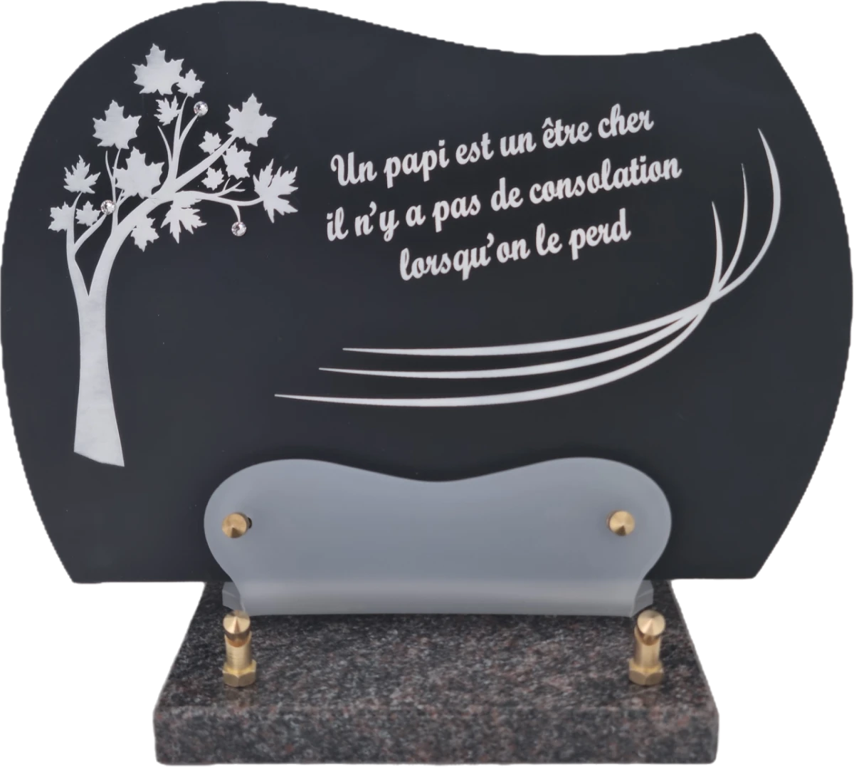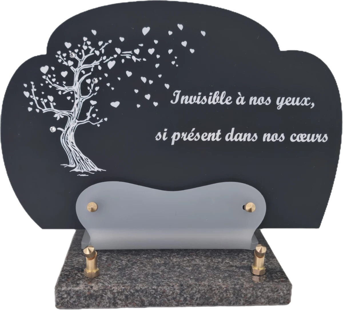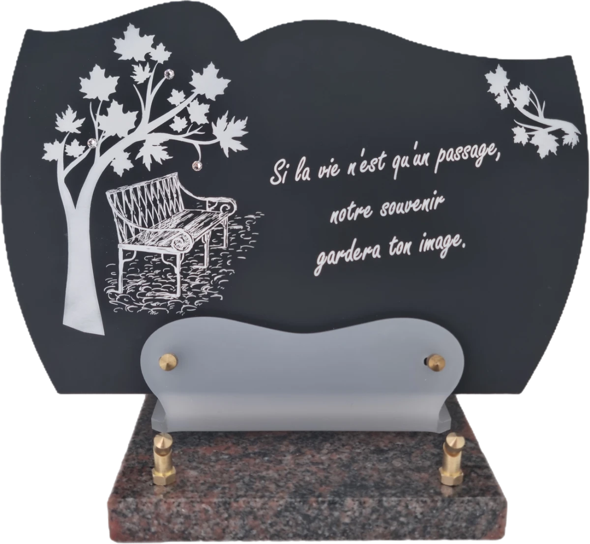 Altuglass Satin Black sur socle granit Plaque en Altuglas sur socle granit représentant un village paisible sous un ciel étoilé, bordé par un arbre de vie.