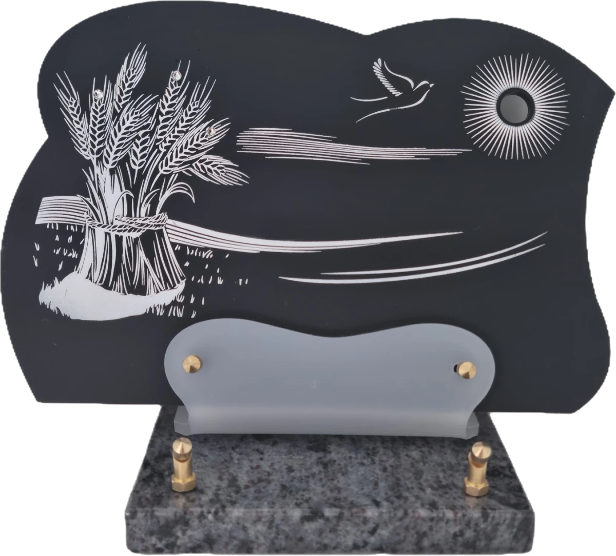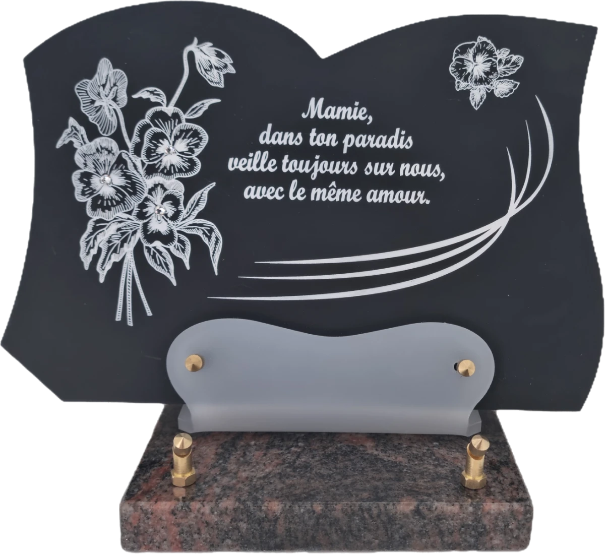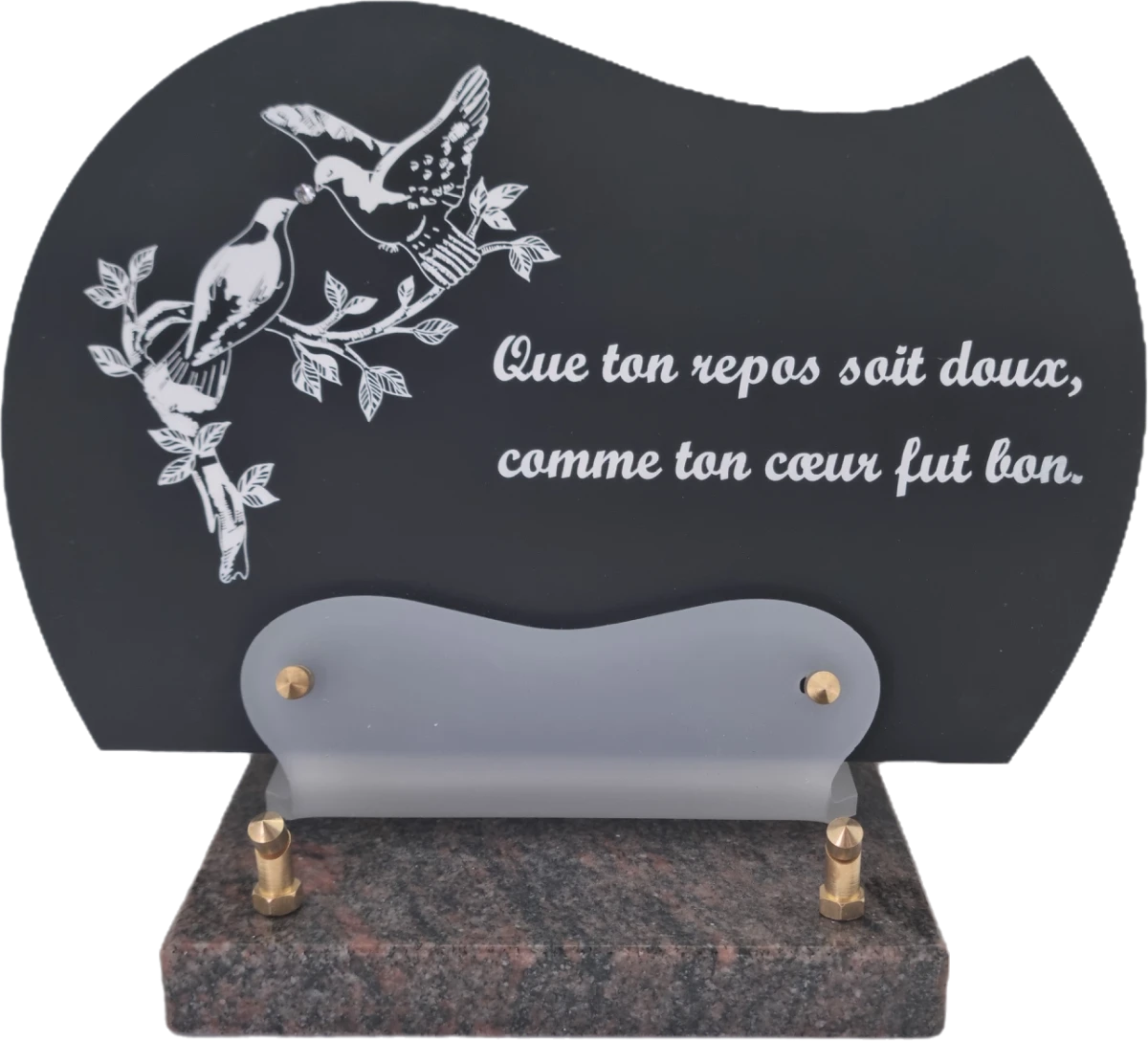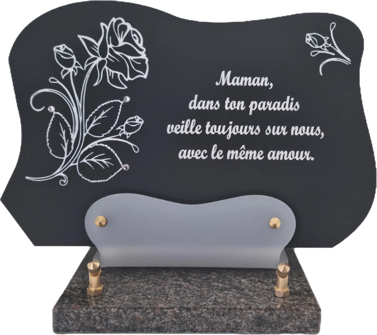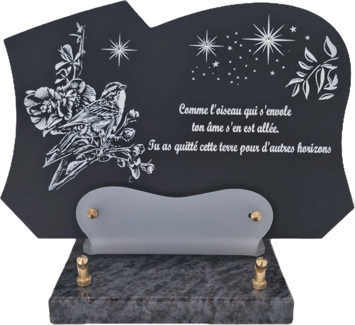 Altuglass Satin Black sur socle granit Plaque en Altuglas sur socle granit représentant un village paisible sous un ciel étoilé, bordé par un arbre de vie.