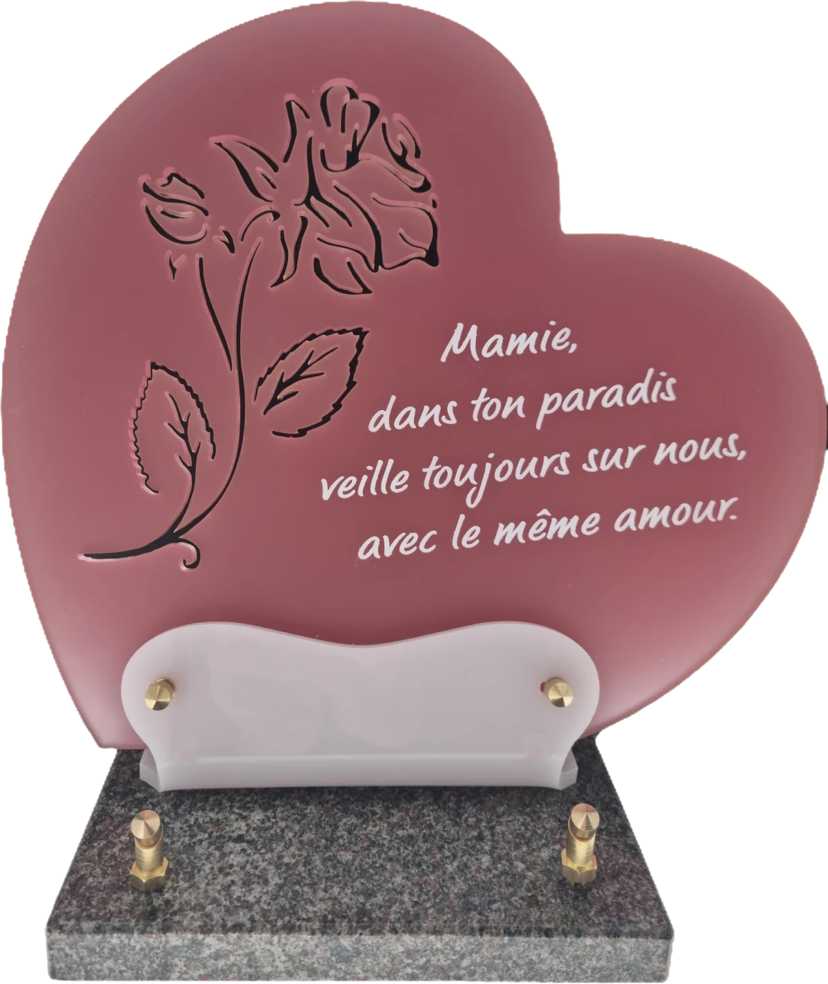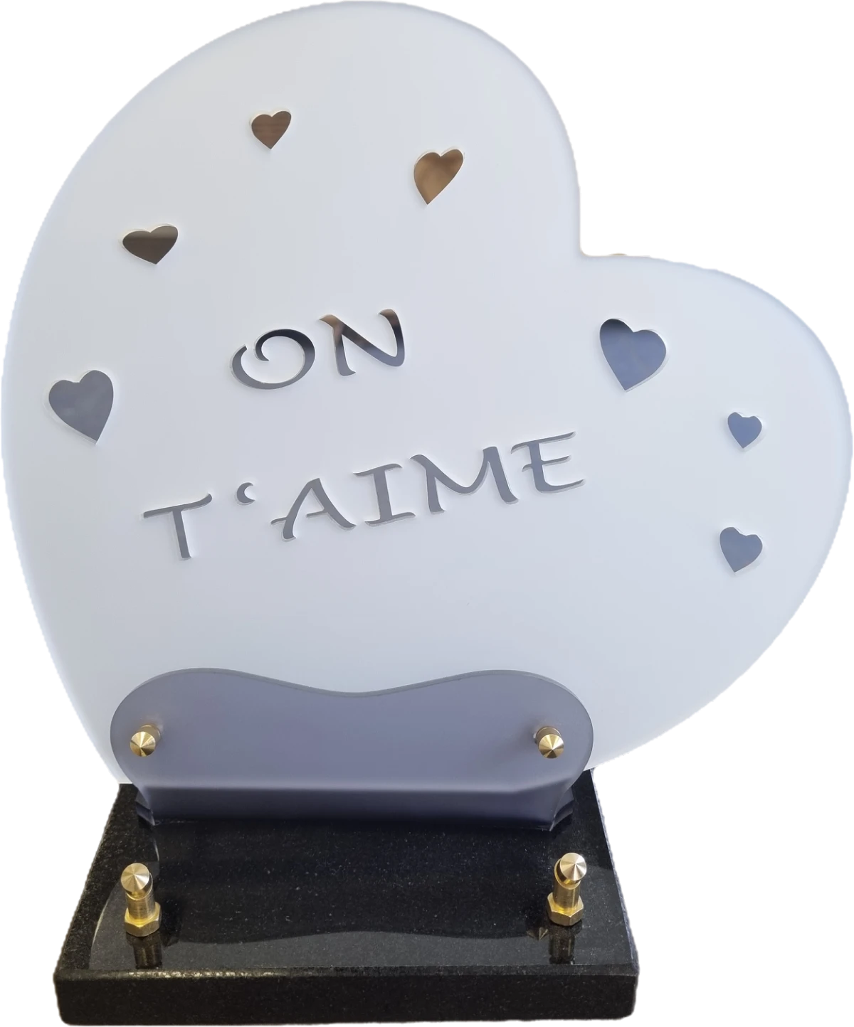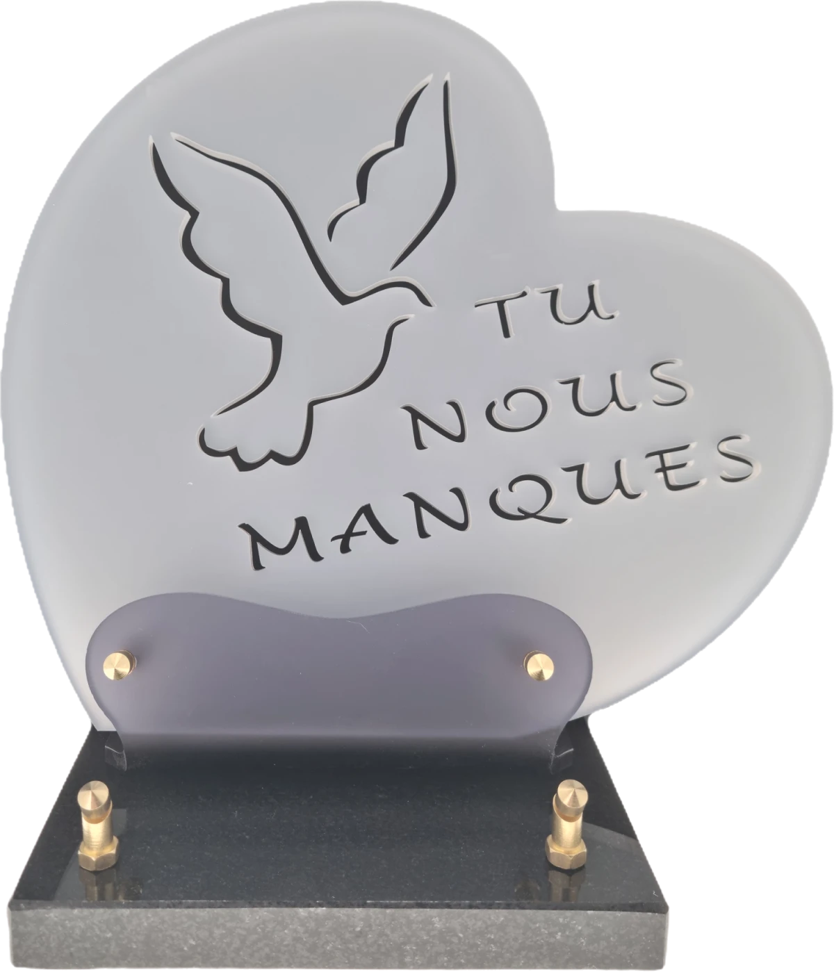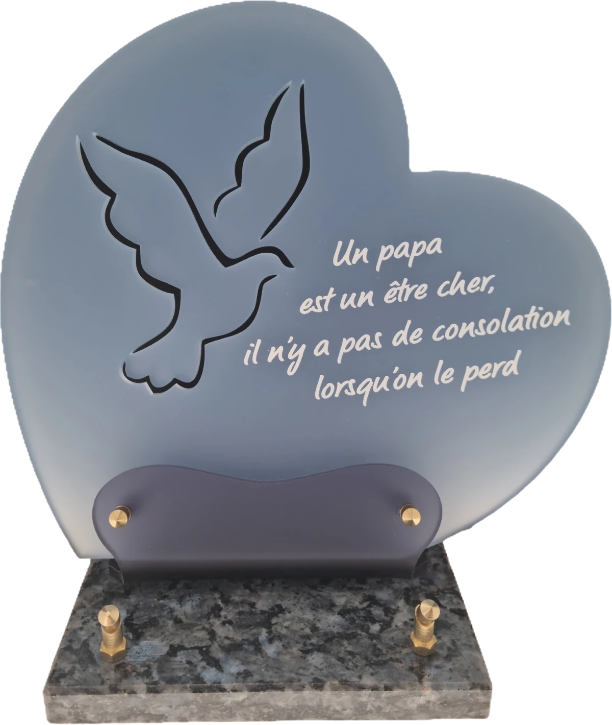 Plaque Altuglass sur socle en granit fixée par vis laiton, en forme de coeur de couleur blanc et ornée d’une colombe évidée. Son design épuré symbolise avec délicatesse la paix et l’envol de l’âme.