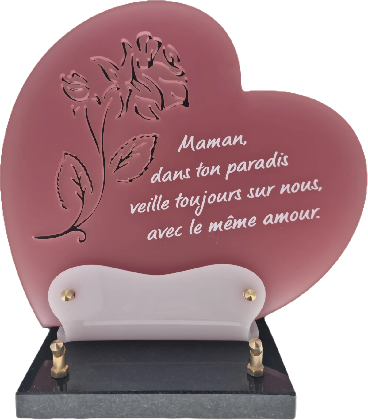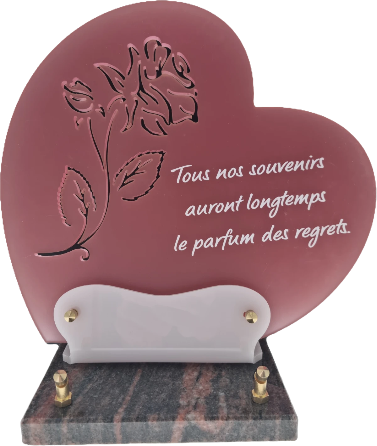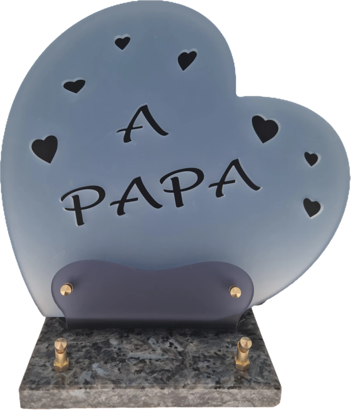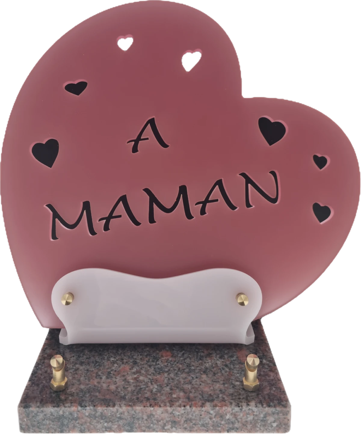 Plaque Altuglass sur socle en granit fixée par vis laiton, en forme de coeur de couleur blanc et ornée d’une colombe évidée. Son design épuré symbolise avec délicatesse la paix et l’envol de l’âme.