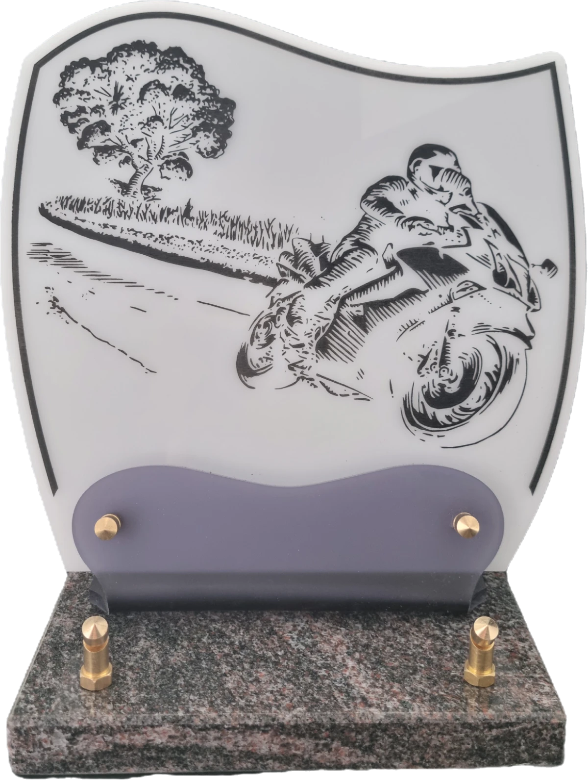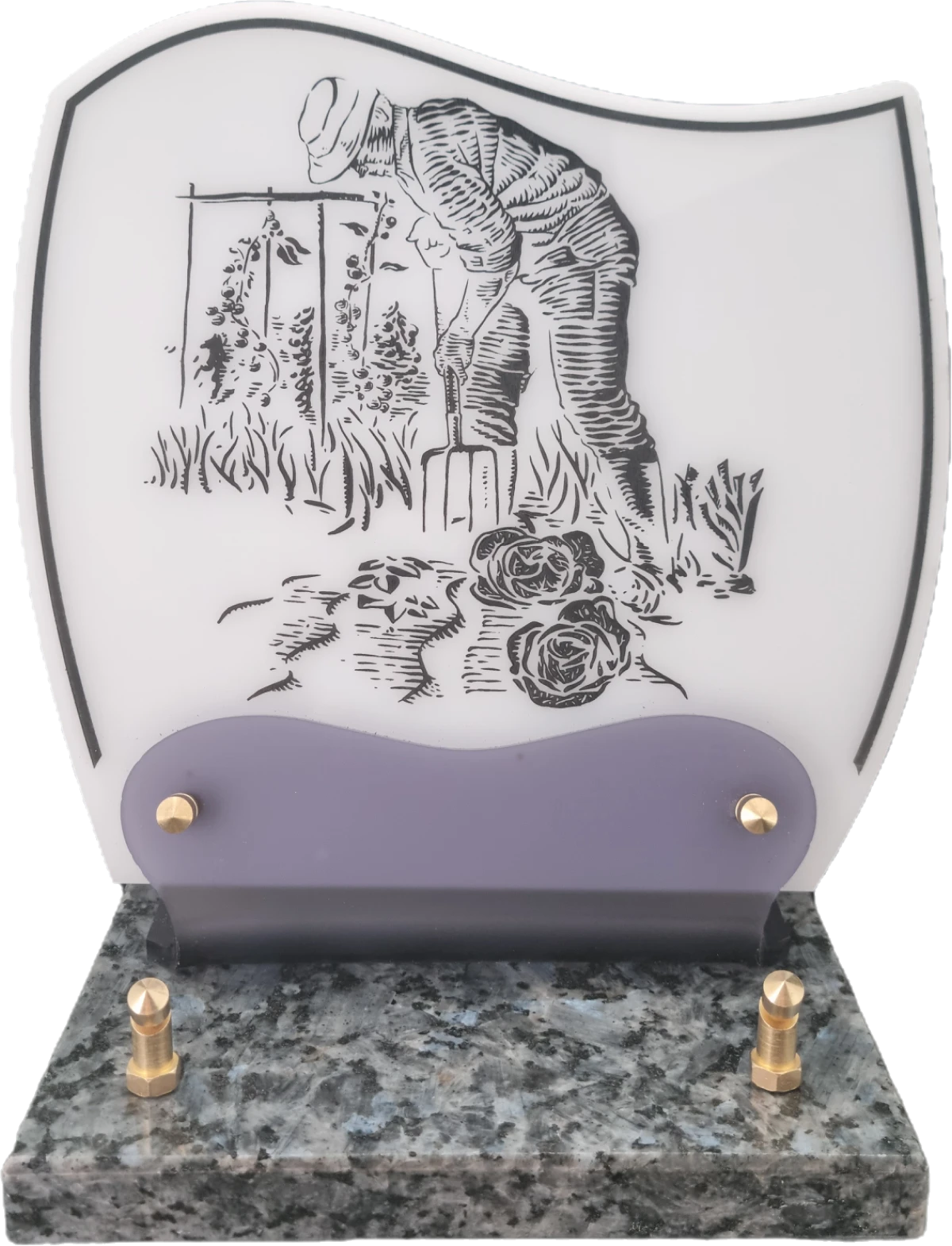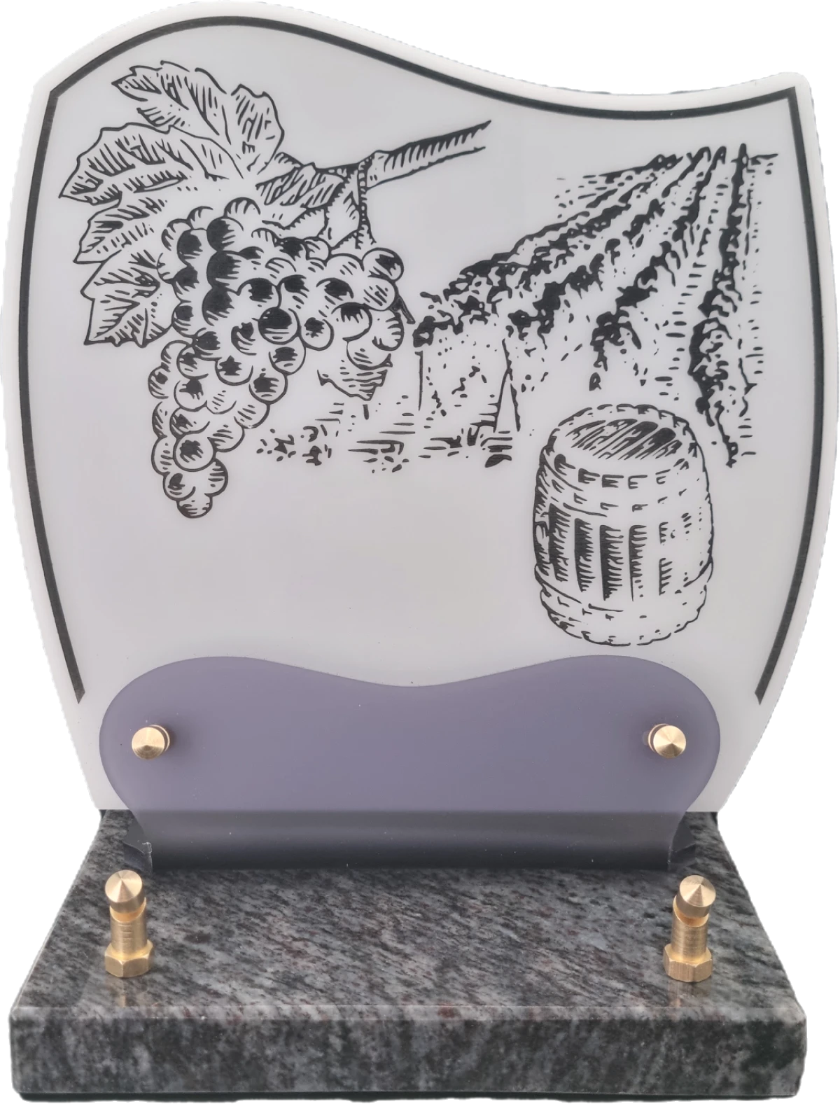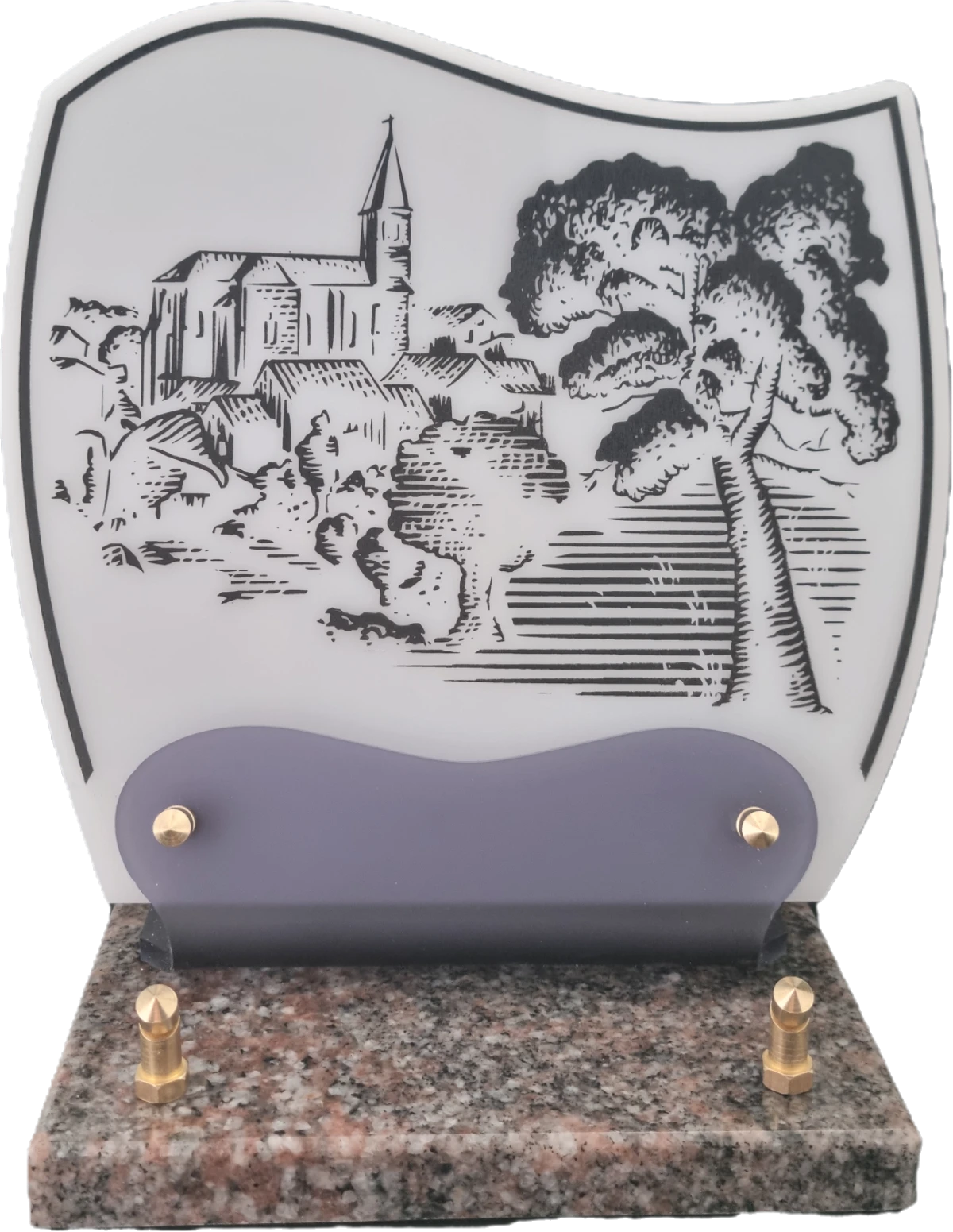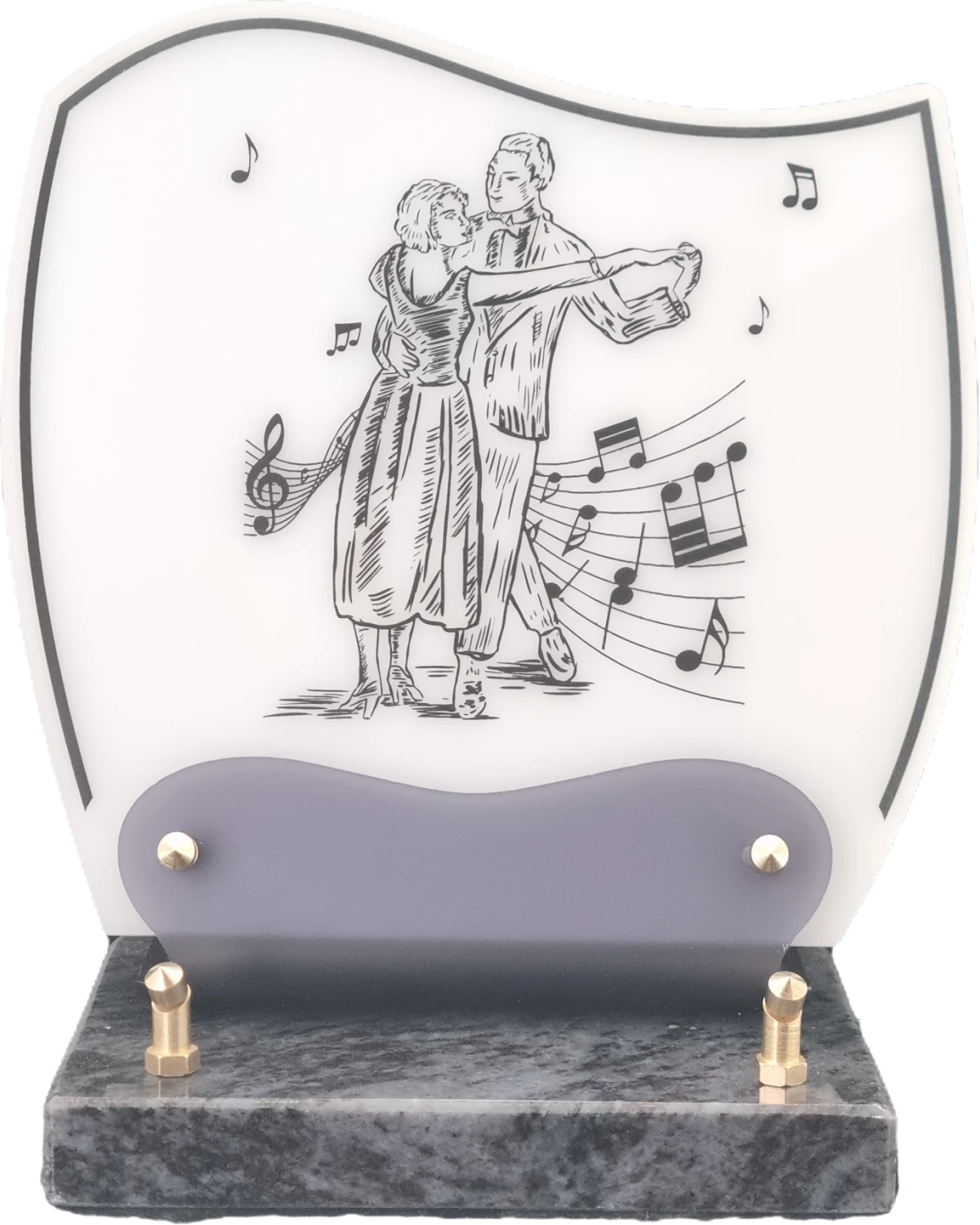 Doucine-Altu sur socle granit Plaque Altuglass sur socle en granit fixée par vis laiton, de couleur blanc ornée d’un décor gravé de portée musicale et de notes évanescentes. Idéale pour un passionné de musique.